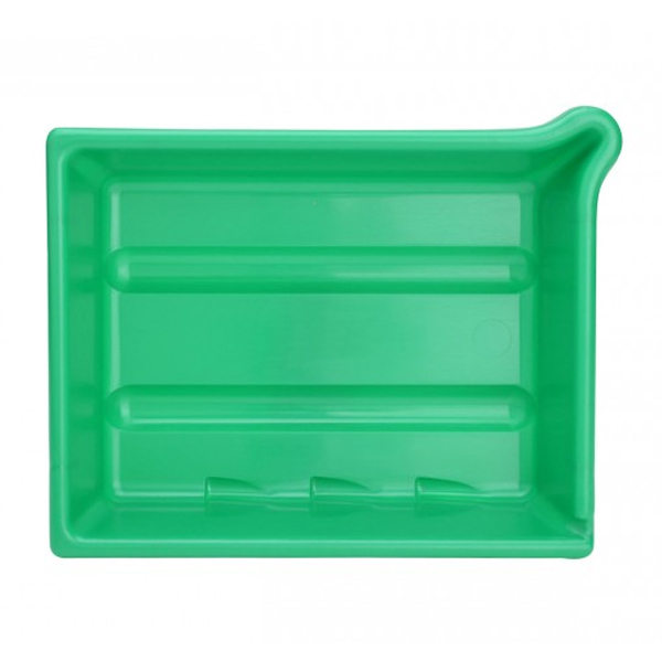AP Photo darkroom developing tray in Green which is suitable for paper up to 16x20 inches (40 x 50cm). Manufactured from high grade plastic which is resistant to photographic chemical solutions. Slots on the bottom to facilitate handling and prevent the paper from sticking. Three thermometer holding slots. Features a pouring lip in one corner for emptying the tray without spillage.