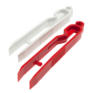 These AP Photo print tongs are designed for handling printing paper during processing in trays. Supplied in a colour coded set, one white and one red. Each tong has a textured side panel to provide a firm grip and deep shoulders to prevent them sliding into the tray of processing solution. In use it is very important that each tong only enters the solution in the tray that the tong is allocated to. Otherwise there can be carry over backwards from the fixer tray to the developer tray, causing chemical contamination.