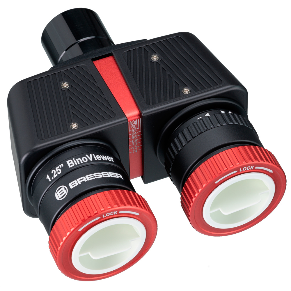 Since the BRESSER BinoViewer Deluxe does not require an additional light path (back focus), it can be used with any telescope - including Newtonians and short focus refracting telescopes, which traditionally suffered when using standard binoviewers. No light path corrector or similar accessory is necessary. If a standard 1.25'' eyepiece can be focused, the binoviewer will also work. The eyepiece focal length and field of view size of the eyepieces used are fully retained. As with binoculars one eyepiece is focused first using the telescope focuser. Then the second eyepiece can be brought into focus using the helical focuser on the binoviewer. The required interpupillary distance is then elegantly adjusted to a range of 58–74mm with the help of a linear sliding mechanism, with graduated marker, to help you find your ideal interocular setting quickly. Self-centring helical eyepiece grips, rather than side-mounted thumbscrew eyepiece retainers are used, decreasing the chance of offsetting collimation of both eyepiece to each other. The fact that this design of binoviewer uses a well-engineered linear slide mechanism to adjust interpupillary distance, rather than a cheaper-to-produce traditional hinged design also helps retention of collimation.
