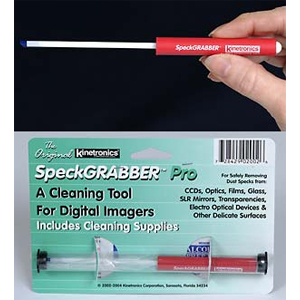 SpeckGrabber is a unique tool designed to remove individual contaminant particles from delicate and sensitive surfaces without danger of damaging or causing additional contamination. A small soft washable pad on the end of the SpeckGrabber provides a high adhesion surface that sticks to contaminant particles with considerably more cohesive force than the contaminated surface. When the SpeckGrabber is put in contact with the particle, it adheres to the particle, while leaving no residue on the contacted surface. The SpeckGrabber is non-conductive, and can be used on active CCDs allowing the technician to monitor the decontamination process. The SpeckGrabber can be used on disk drive heads, optical sensors such a CCD arrays, mirrors and lenses, UV windows, films and silicon wafers among other hard to clean surfaces. SpeckGrabber Pro model has a heavy-duty rubberized grip and can be repeatedly cleaned in water, or soap solution without diminishing its adhesive qualities.