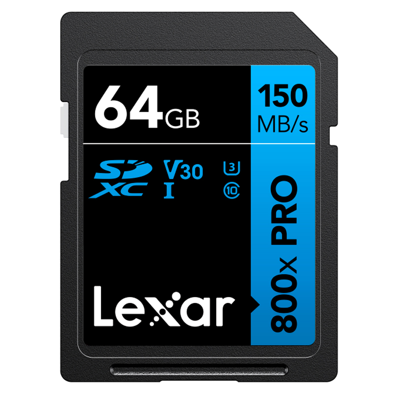 - Lexar 800x Pro Blue series SDXC memory card with a 64GB capacity.