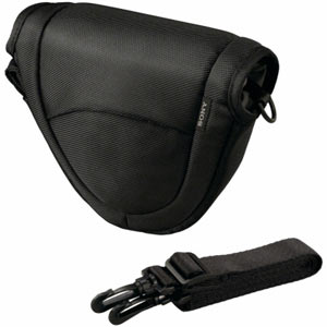 Genuine Sony camera case which is perfect for carrying a Sony NEX series camera. Will accomodate a NEX camera with an attached 18-55mm zoom lens plus 16mm pancake lens and accessories. Ideal for a Sony NEX twin lens kit. Additional accessory pocket for a spare battery, memory cards and the camera's clip on flash. Supplied with shoulder strap. External pocket for the lens cap. Belt loop for carry at waist height.
