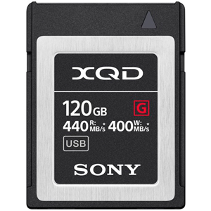 Sony G series high speed XQD memory card with 120GB storage capacity. Up to 440MB/s read and 400MB/s write speeds, perfect for RAW files, 4K and full HD video recording in high end cameras and camcorders. The XQD G series supports the Sony consumer 4K camcorder, the FDR-AX1. The latest QD-G120F and QD-G240F cards are significantly more robust than standard XQD cards, up to 5 times more drop resistant and up to 2.5 times more resistance to bend forces, increasing durability under repeated extraction / insertion in camera card slots. Please make sure your camera or camcorder is compatible with XQD memory cards before purchasing.