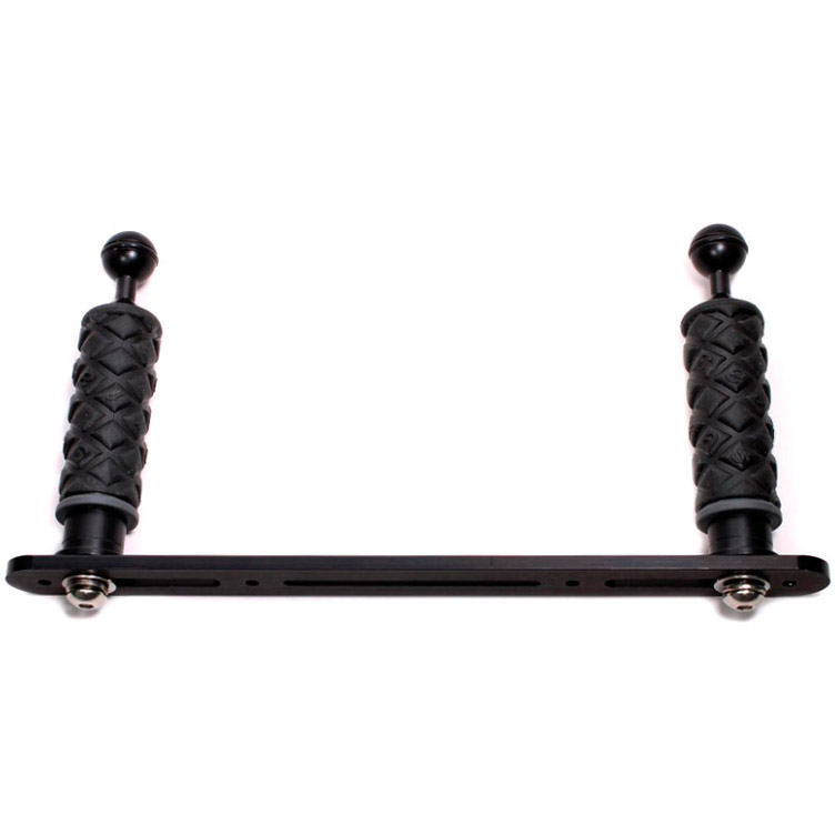 The CTKL-01 large camera tray package using the TR-DM2 tray with double handles. Includes two AC-H handles with black grips and one TR-DM2 tray. Made out of 6061 T6 aircraft-grade aluminium with Type III anodizing. Hardware is 316 stainless steel. Will work in the harshest of environments and built to last. The Ultralight TR-DM2 Dual Handle Tray has been designed to support 2 handles in order to provide stability when shooting. It is ideal for use with compact and mirrorless housings. The tray is 13" long, 1 1/4" wide, and 1/4" thick. It has one 4" long 1/4" slot and two 2 3/8" long 3/8" slots, four 1/4" threaded holes. Any ULCS handle will fit the TR-DM2.