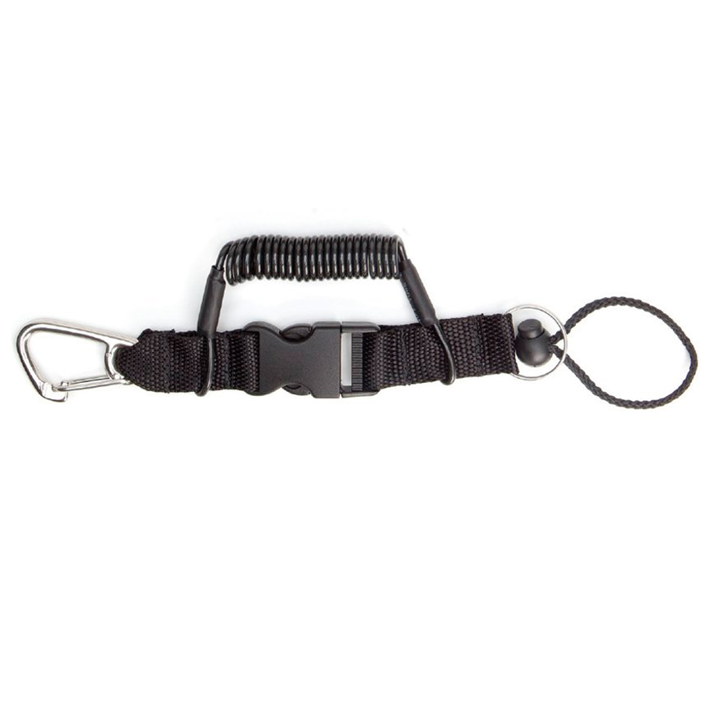 One end has a stainless steel carabiner clip. The other end has a stainless steel split ring and cord with lock. These coil lanyards are reinforced with internal stainless steel cable for maximum strength. Just disengage the side release clip to extend the coil lanyard a full 52 in (132 cm). Fastens back to a secure, compact position in seconds. Ideal for use with gauge consoles and medium sized lights.